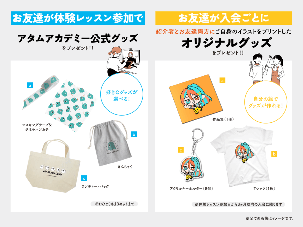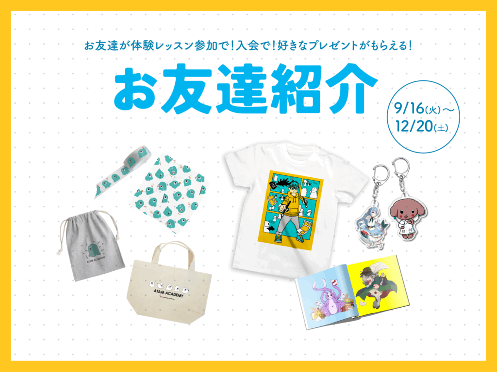 期間中、アタムアカデミーをお友達へ紹介いただいた会員様へ、素敵なプレゼントをご用意しておりますので、是非ご参加いただけますと幸いです。