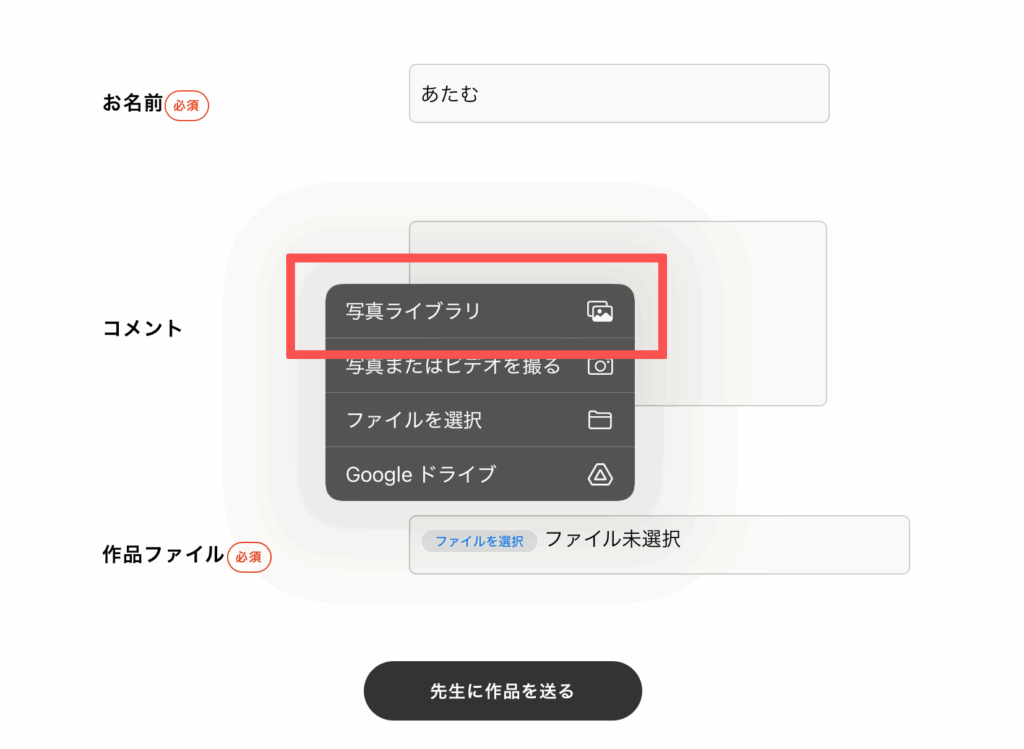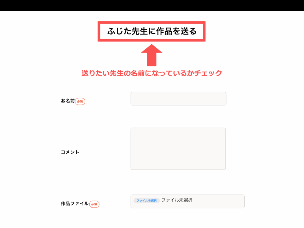 画面に表示される通知をタップすると、「○○先生に作品を送る」という専用ページへアクセスできます!