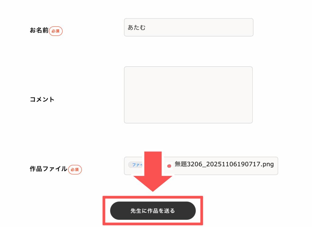 最後に一番下の「先生に作品を送る」のボタンを押すと、先生に作品を届けることができます。