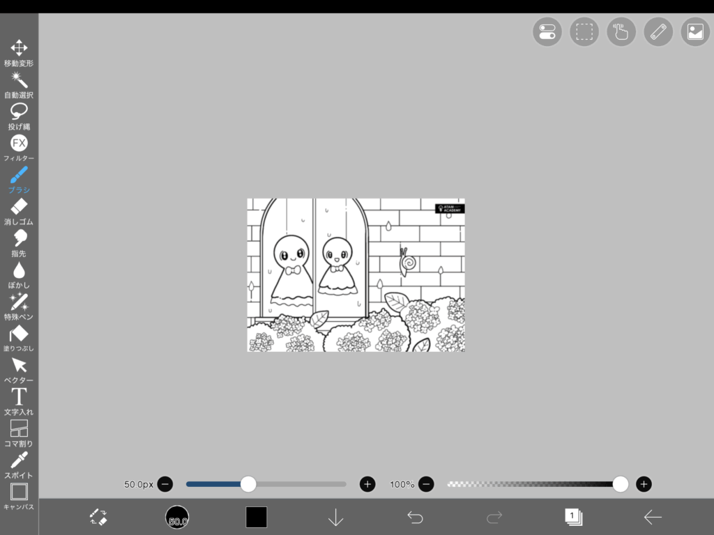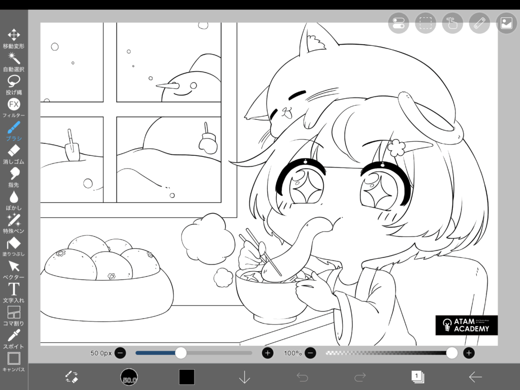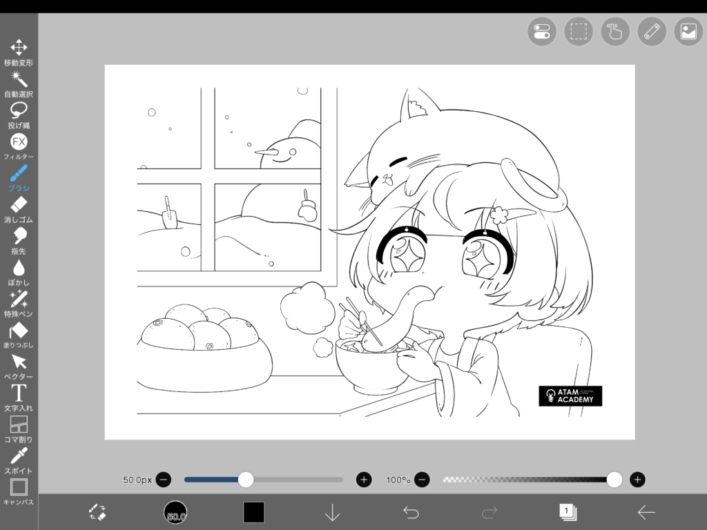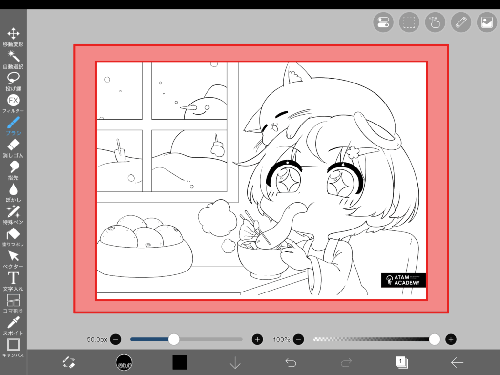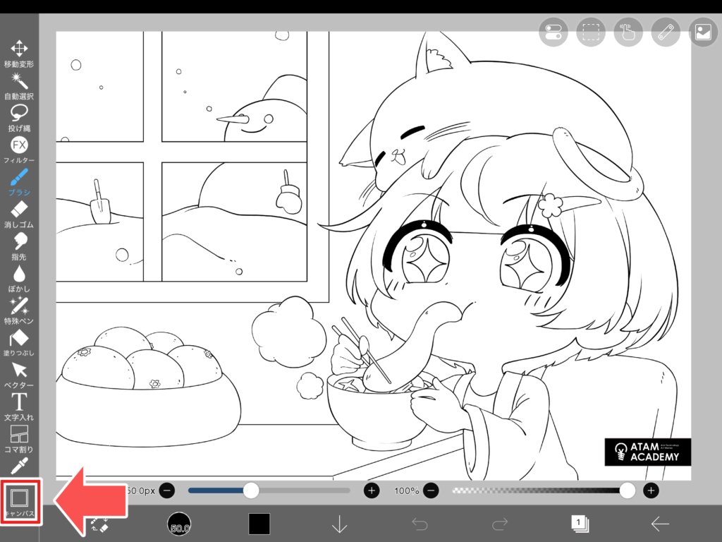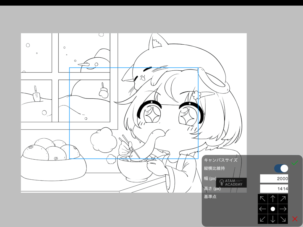 イラストより小さいキャンバスにすると、イラストが切り取られるので、注意してください。