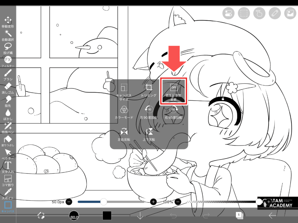 「画像解像度変更」で作品の大きさを変えると、イラストを切り落とさずにサイズ変更ができます。