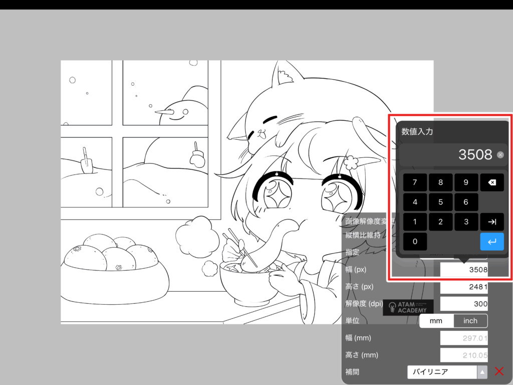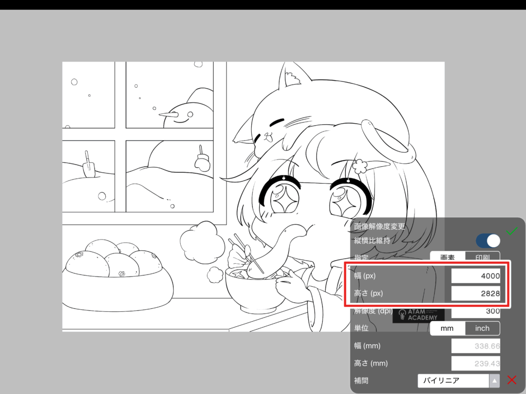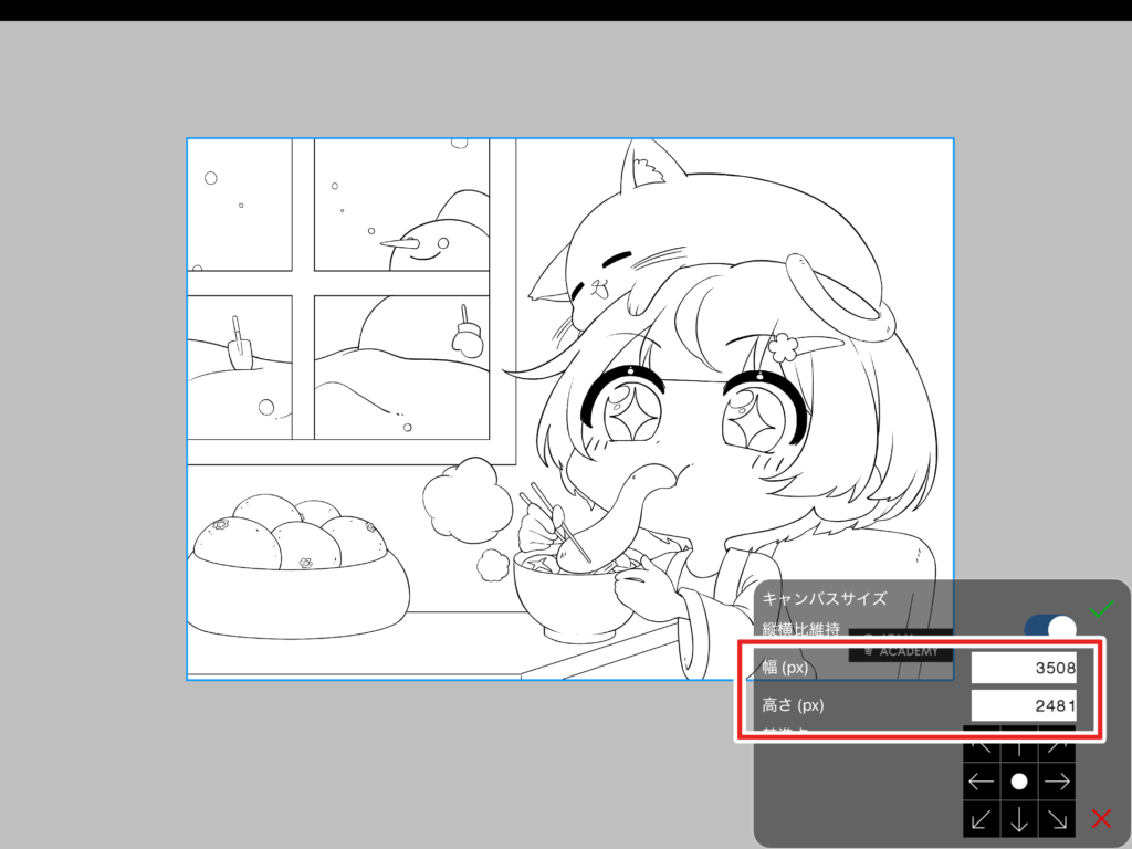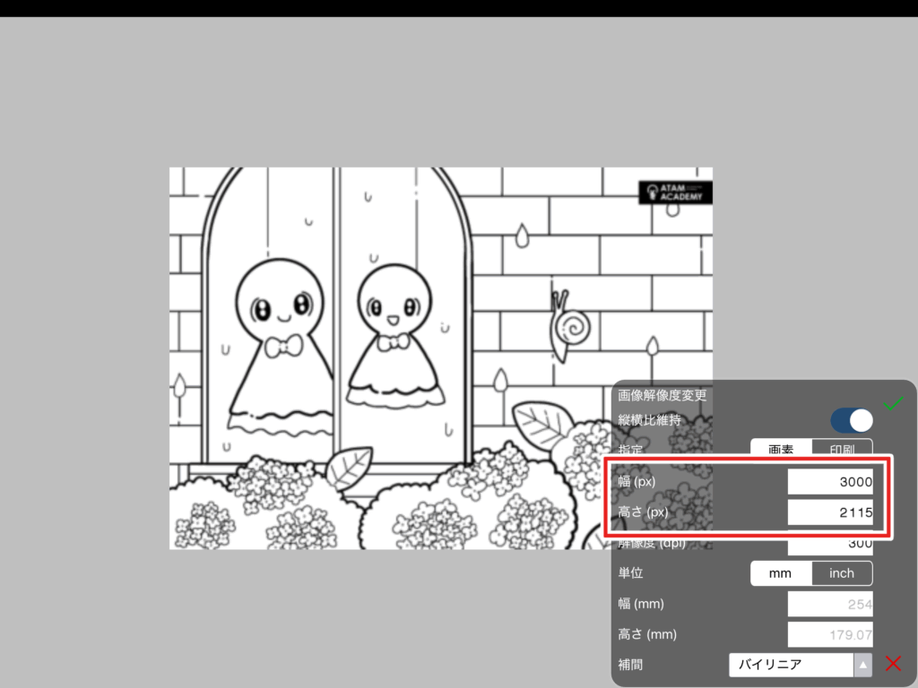 幅を3000px、高さを2115pxにしてチェックマークを押します。