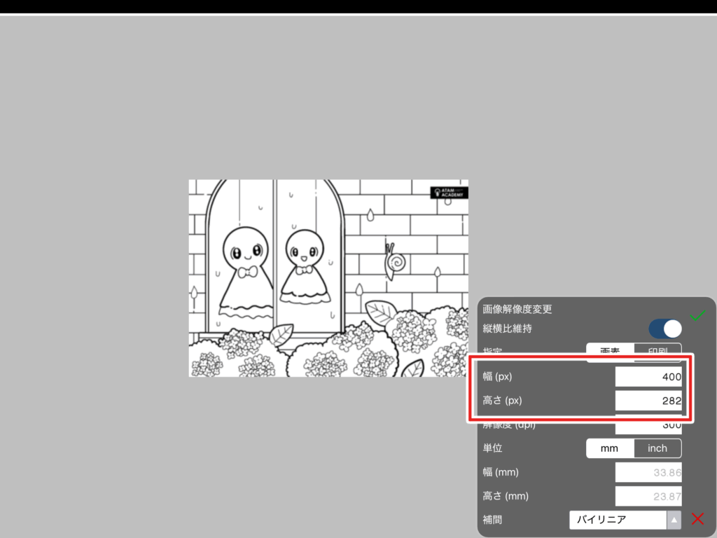 このように、小さいイラストの画像解像度(がぞうかいぞうど)を変更してみます。