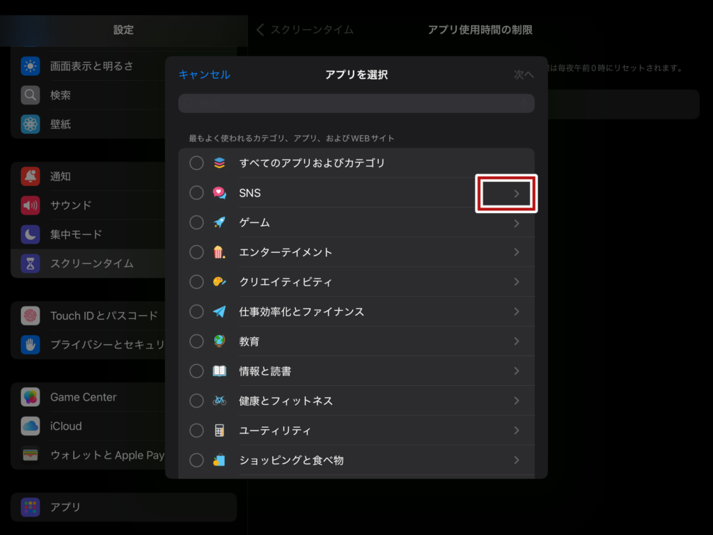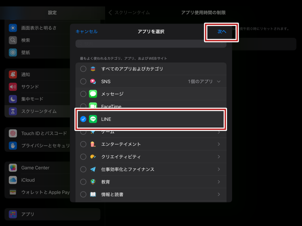 制限を設けたいアプリを選択後、次へをタップしてください。