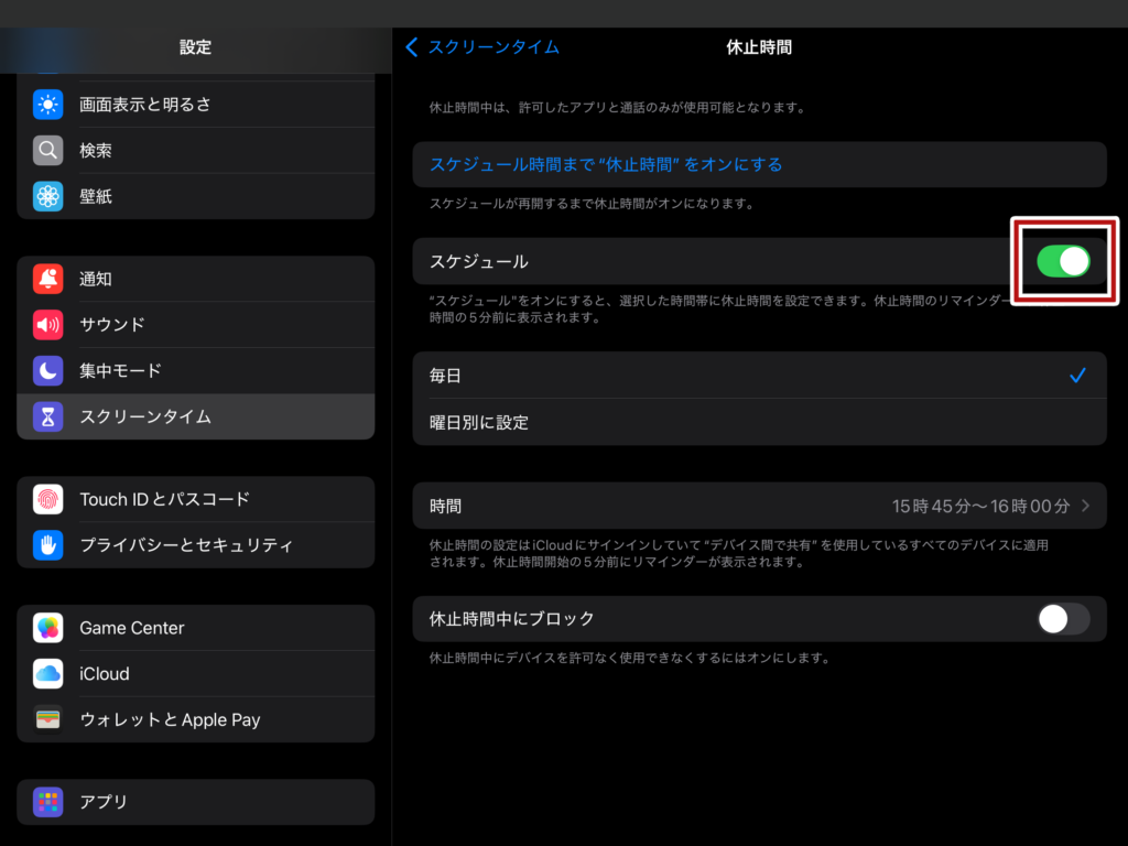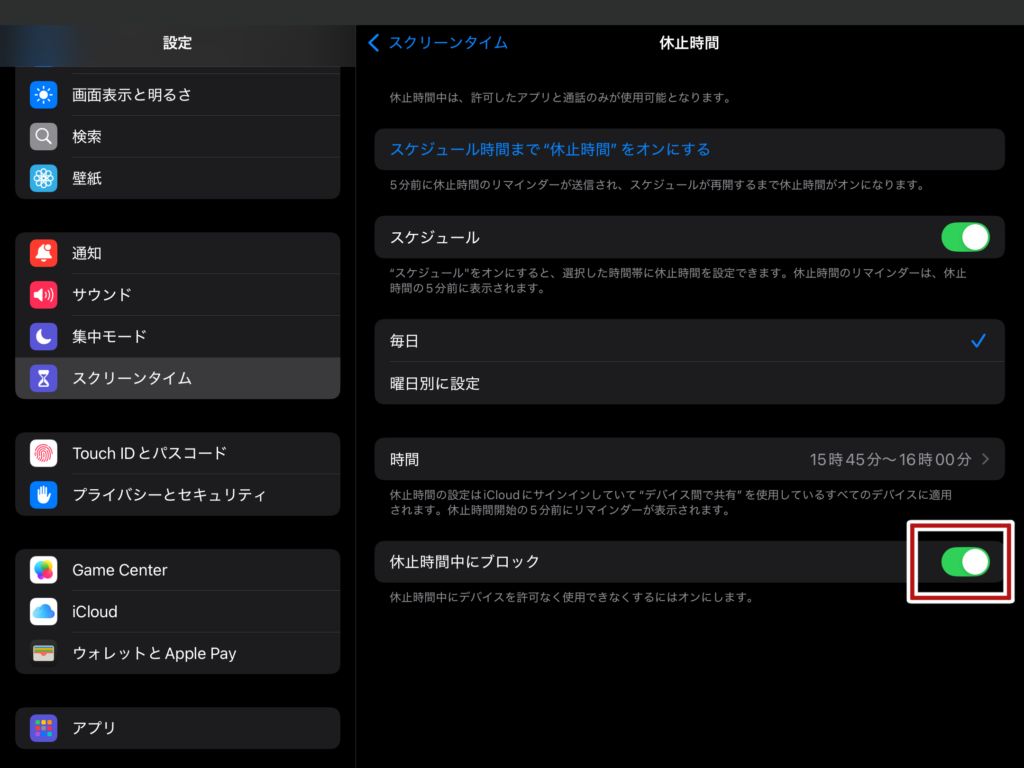 「休止時間中にブロック」をONにすると、設定が完了します。
