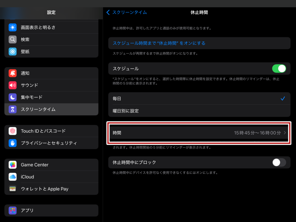 今回は例として、毎日決まった時間にipadを使用できないように設定します。