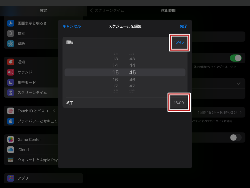 開始時間と終了時間を設定し、完了をタップしてください。