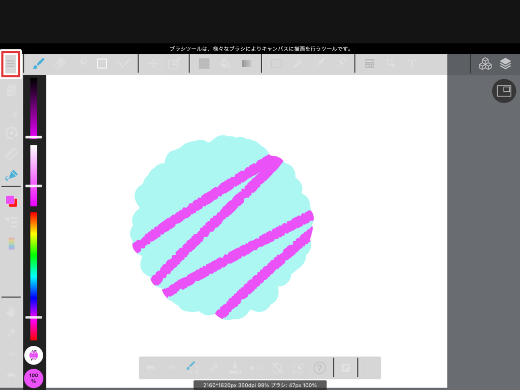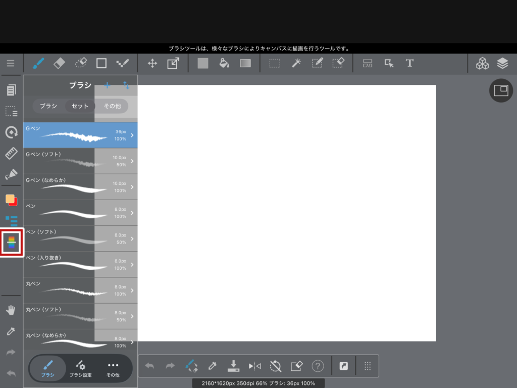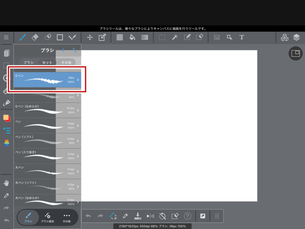 左上のブラシのアイコンをタップすると、色んな種類のブラシが表示されます。