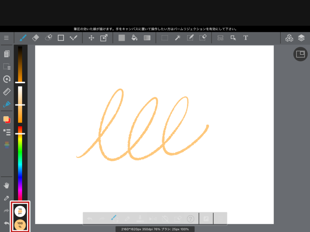 左の赤枠で囲っているアイコンを押すと、太さや透明度を変えることができます。