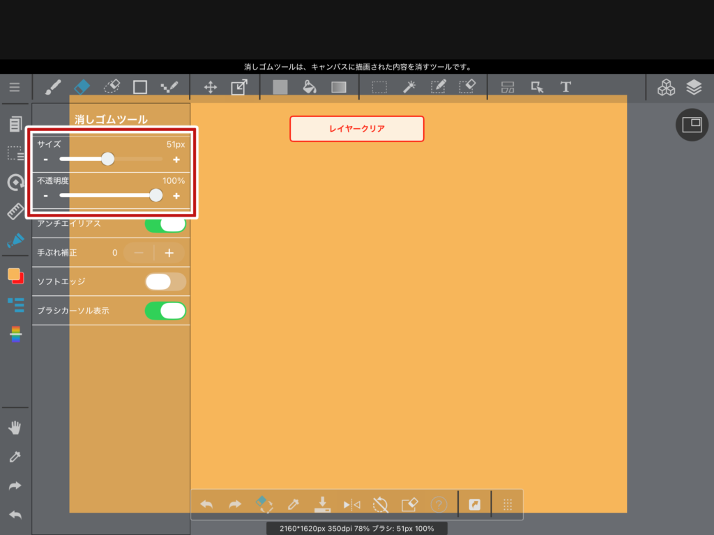 消しゴムツールをタップすると、サイズや不透明度を設定する画面が開きます。