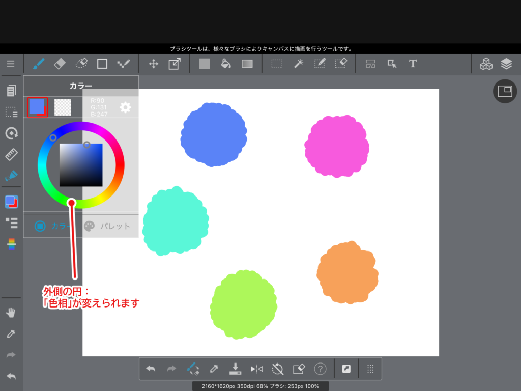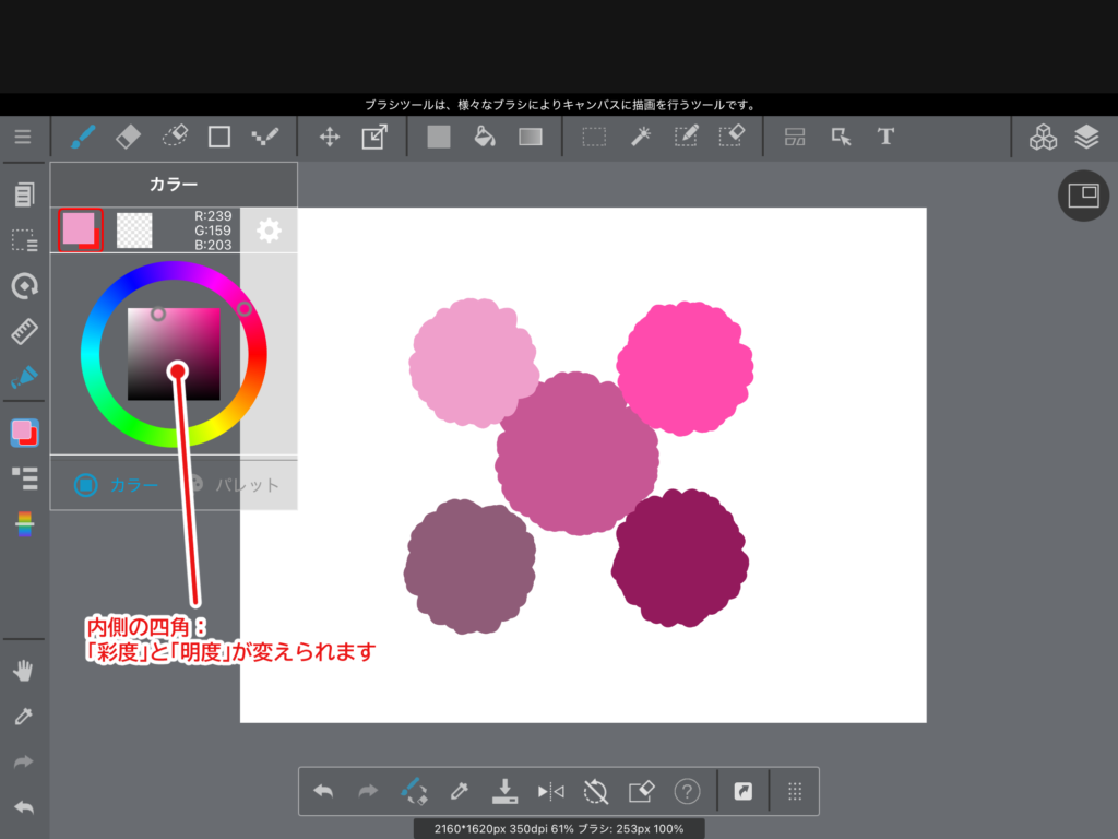 カラーサークルの内側の丸では「彩度(さいど)」と「明度(めいど)」を変更できます。