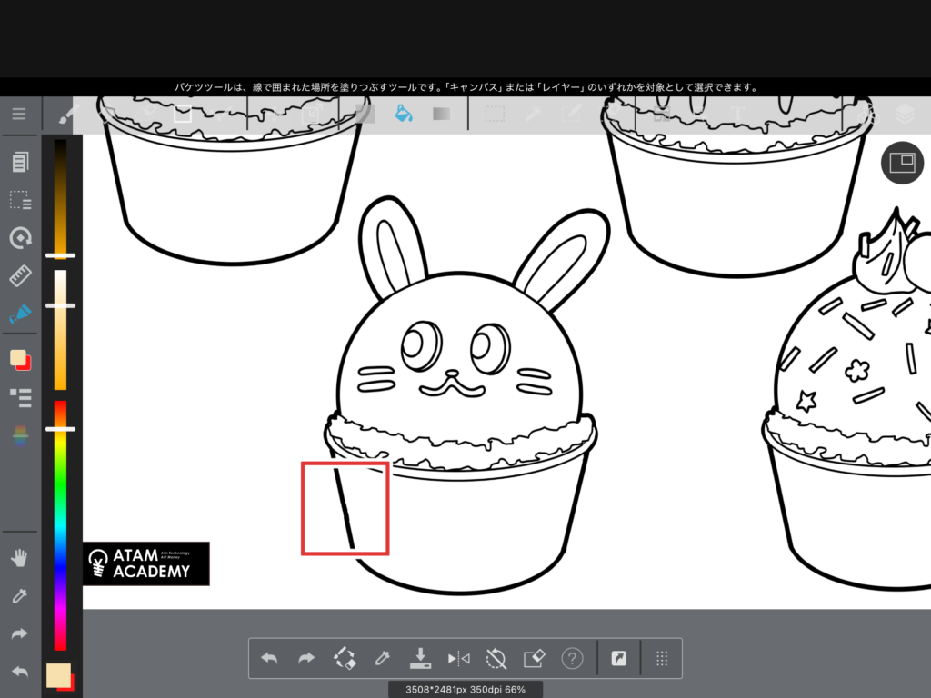 この時、線と線が綺麗につながっていないと、色がはみ出してしまうので注意してください。