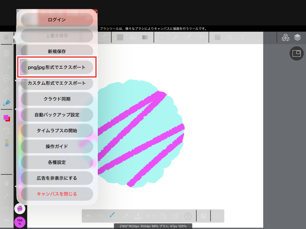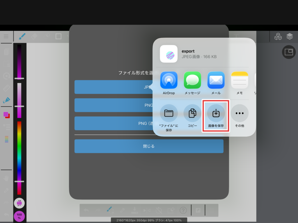 「png/jpg形式でエクスポート」をタップします。