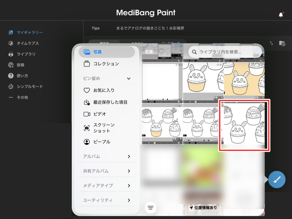 「画像を保存」を押すと、iPadの「写真」フォルダに作品が保存されます。