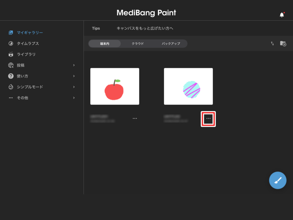 削除(さくじょ)したい作品の右下にある「…」をタップします。