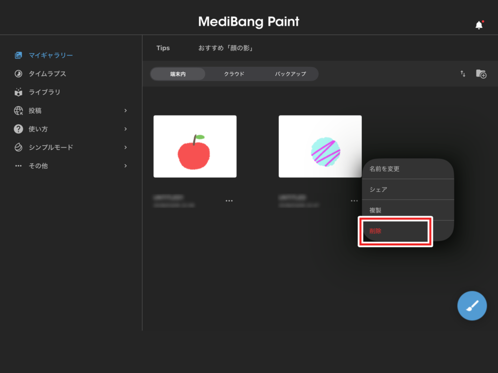 「削除(さくじょ)する」をタップすると、作品が削除(さくじょ)されます。