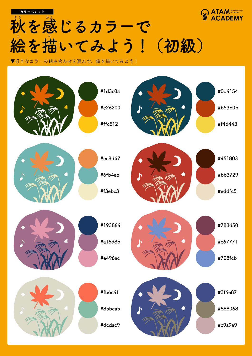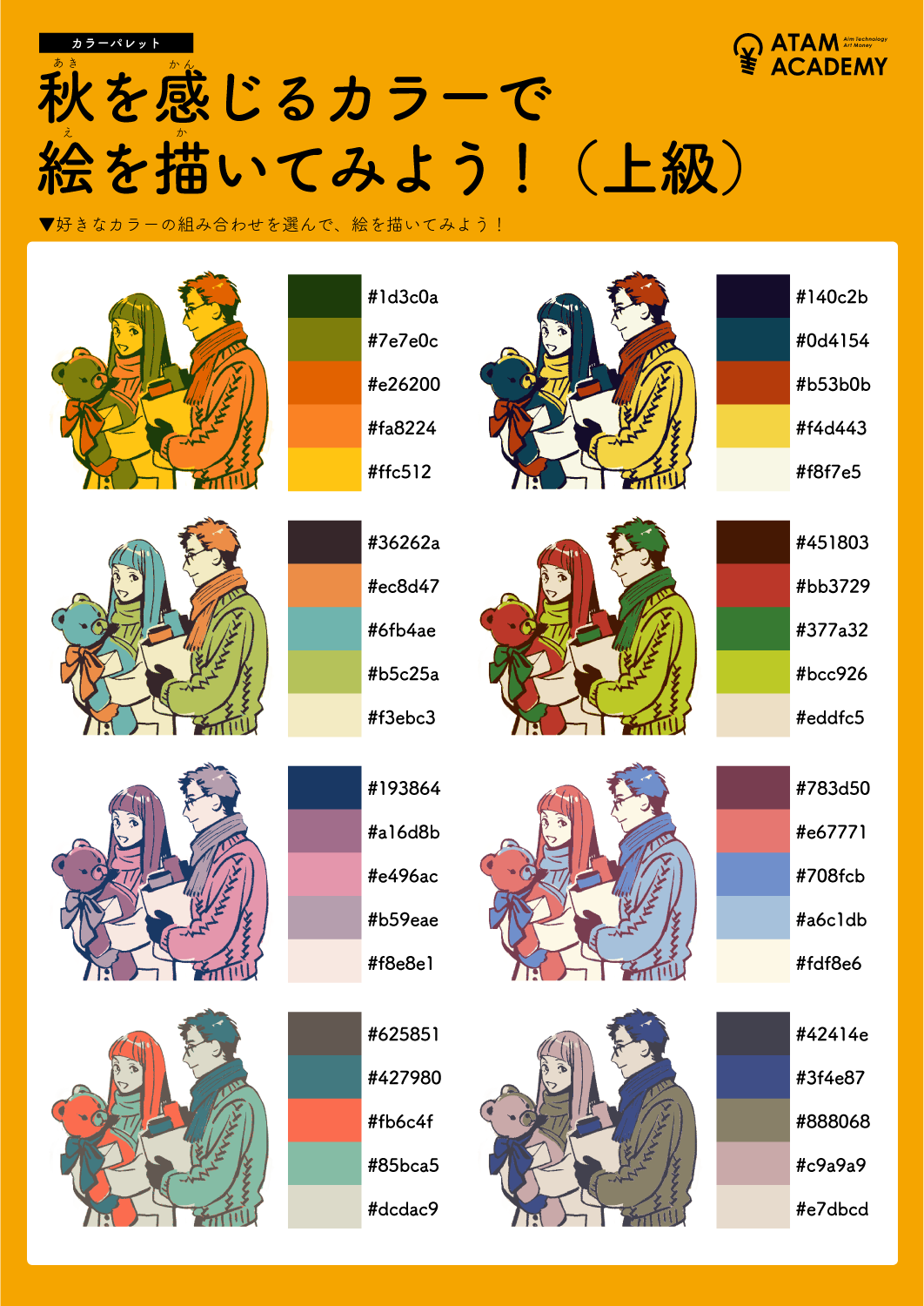 いくつかの色がひとつのセット(パレット)になっています。 ひとつのセットを選んで、その中の色だけ使ったイラストを描いてみましょう!